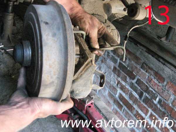 После чего, с двух сторон, немного подымаем кузов автомобиля домкратами. И для того, чтобы снять колесо, придется приподнять край балки, например домкратом-трацеей. Когда колесо снято, можно полностью откручивать гайки цапфы и снимать ее вместе с тормозным барабаном и колодками. В этот момент особое внимание следует уделить тормозным трубкам, так как их можно легко поломать. Далее медленно опускаем домкратом край балки и вынимаем пружину. Аналогично разбираем другую сторону. Смотрим фотографии 12,13,14.