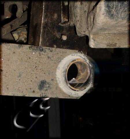 Когда пружины сняты, можем по очереди вынимать болты крепежа балки к кузову и снимать балку. Балка снята, и теперь можно рассмотреть в каком состоянии сайлентбоки. Если резина сайлентблока оторвалась от наружной обоймы, то можно смело брать кувалду и наставку, и начинать выбивать (фото 15). Или же съемником выпресовывать резину с внутренней втулкой и после чего приступать к извлечению наружной части сайлентблока с проушины балки. Для этого будет достаточно позагинать края втулки и выбить ее (фото 16) или просто распилить ее ножовкой.