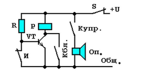 При размыкании контактов датчика сигнализации через резистор R базовый ток открывает транзистор, который включает реле.