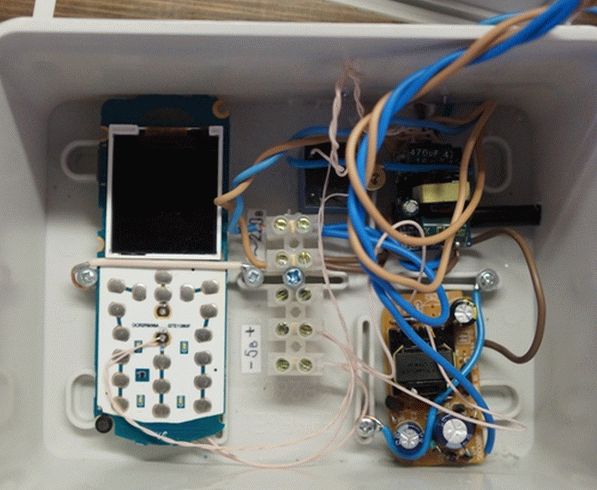 - К кнопке для отключения телефонного разговора припаивают проводок, и связывают его с выключателем, функция которого заключается в активации и снятии охраны. Два провода, идущих от клавиатуры, пайкой связывают с герконом стандартной схемы.
