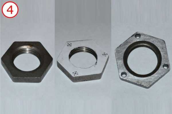 Всасывающий патрубок изготовлен из чугунного угольника Ду40 водопроводной арматуры. Зажав в патрон токарного станка обрезок трубы Ду40 (1 1/2’’) с резьбой на конце и навинтив на нее угольник, Вы можете проточить посадочное место диаметром 52 мм. Для резинового соединительного патрубка, укоротить угольник согласно чертежу и снять бортики. Затем с помощью круглого напильника снимите внутри угольника резьбу и литейные неровности. Всасывающий патрубок припаивается латунью к крышке кожуха воздухонагнетателя, а после пайки плоскость кожуха надо отрихтовать на краю ровной плиты.