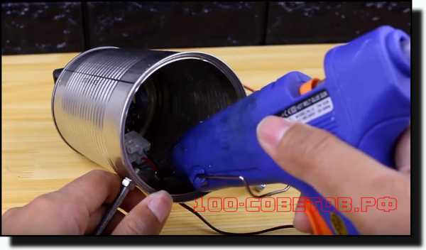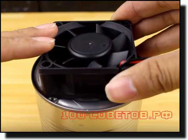По углам нашей банки копаем термоклея и сажаем на него вентилятор.