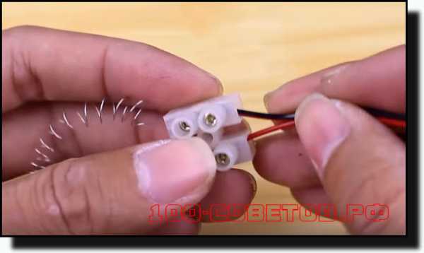 Далее взял электрические, клеммные колодки и с одной стороны закрутил в неё нихромовую нить, а с другой стороны прикрутил обыкновенные провода.