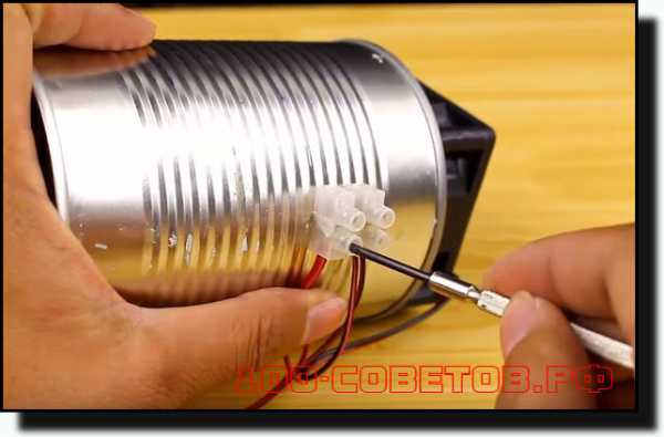 Провода соединяем параллельно с вентилятором, закручиваем в ещё одну колодку и эту колодку приклеиваем в банке на всё тот же термоклей.