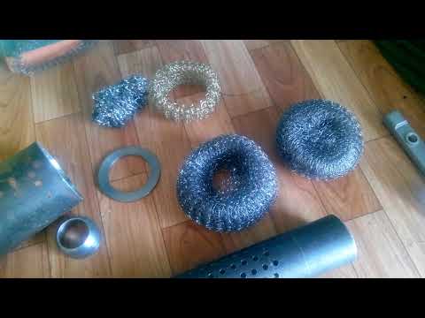 Полость между трубами желательно заполнить для лучшей работы пламегасителя. Некоторые для этого используют металлические губки для мытья посуды. Поскольку они обычно сделаны в виде кольца, то их попросту надевают на внутреннюю трубу. Полость нужно заполнить полностью.