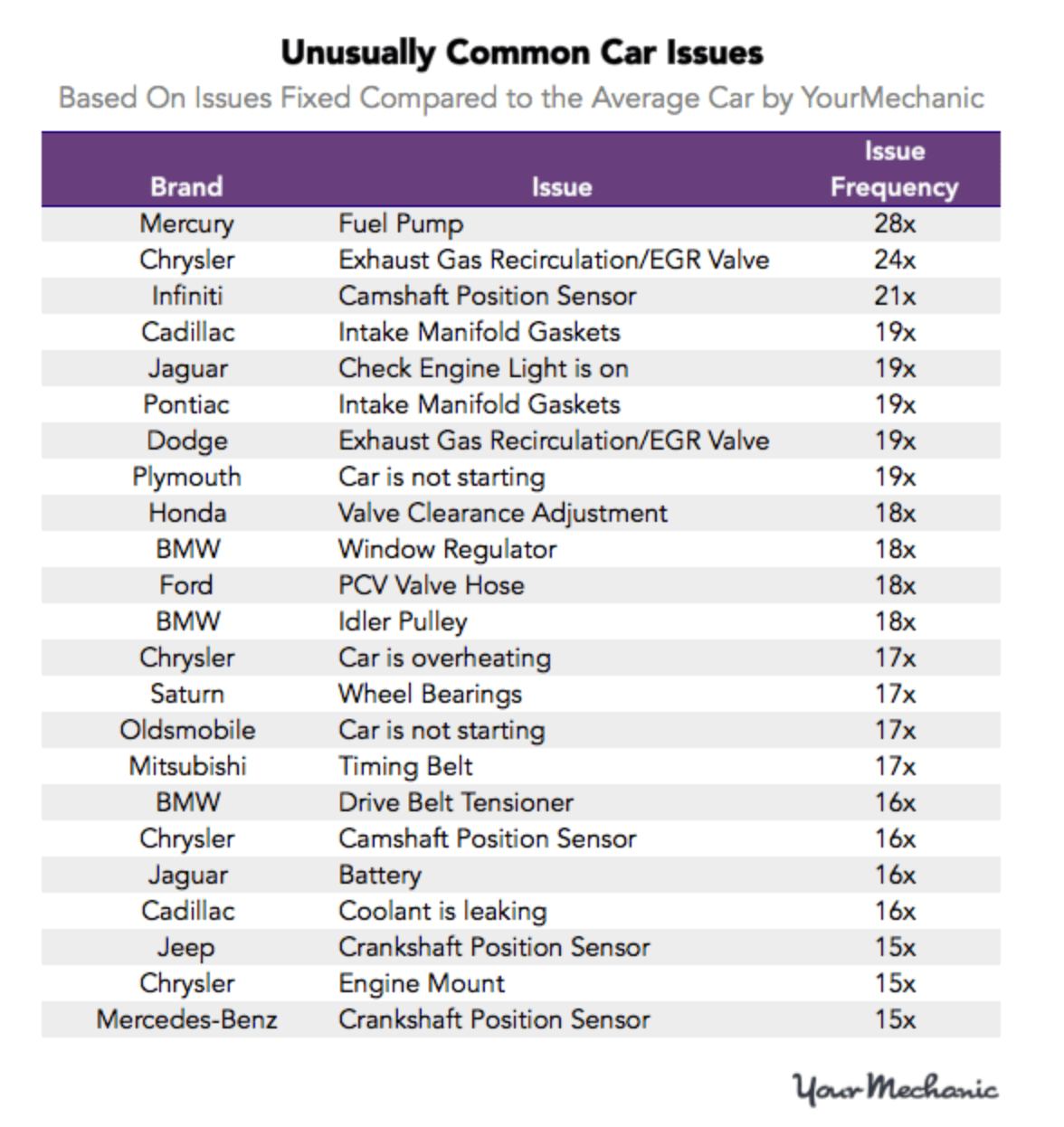 Совокупный объем расходов на обслуживание авто был положен в основу рейтинга легковых автомобилей, составленного одной из крупнейших североамериканских сетей, торгующих автозапчастями — YM (YourMechanic). Согласно собранной менеджерами YM статистической информации, обладатели автомобилей немецкого концерна BMW за 10 лет использования своей машины будут вынуждены потратить почти 20 тысяч долларов. Это те расходы, что вынужден нести автомобилист для поддержания транспортного средства в исправном состоянии.