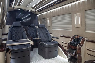 Широкий обзор обеспечивают большие окна. Приятной поездку делают кресла Люкс и мультимедийная система. Салон легко трансформируется благодаря складывающимся сиденьям. Для ручной клади есть полки, для крупногабаритного багажа — специальный отсек.