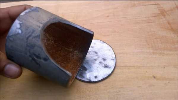 Будем делать нижнюю и верхнюю опоры. Нам понадобиться кусок листовой стали максимальной толщины. Вырезаем в нем круг, также можно сделать с помощью болгарки. Для упрощения работы, нужно сначала вырезать из листа прямоугольник, а потом зашлифовать острые края и круг готов. Нужно всего два таких круга.