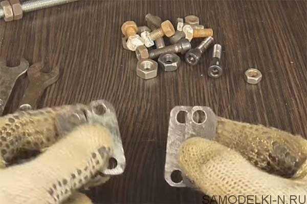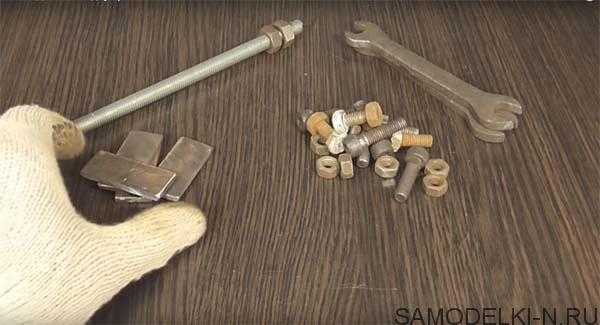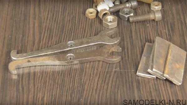 И так автору для данной самоделки потребовались такие материалы: шпилька М 10, пару гаек к ней, четыре прямоугольные металлические пластины толщиной 4 мм и длинной 50 мм, два рожковых ключа одинаковых (у автора 12 на 14) и ещё несколько болтов М 8 и гаек к ним.