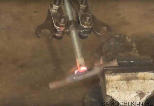И в завершении к шпильке он приварил кусок арматуры которая будет служить в качестве ручки.