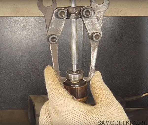 Протестируем нашу самоделку. В качестве испытаний подойдут подшипники с дрели. Как мы видим, изделие справляется с заданием. Теперь вы без страха и риска можете ремонтировать ваши инструменты, не боясь испортить их. Также конструкция подойдет для демонтажа втулок. Если в процессе использования съемника вы замечаете что ось слишком тонкая, то под снимаемый подшипник можно подложить подставку или сделать съемник меньшего размера. Все в ваших руках.