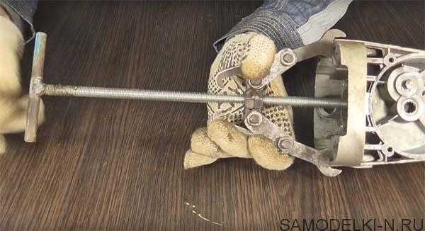 Работать приспособлением довольно просто, достаточно зацепить подшипник захватами, упереть шпильку по центру и вращательными движениями извлечь подшипник с оси детали.