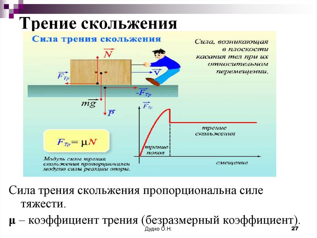 Формулы: Сила трения Сила сопротивления Fтр= μ N Fтр — сила трения (Ньютон), μ — коэффициент трения, N — сила реакции опоры. При малых скоростях силу сопротивления прямо пропорциональной скорости движения. При больших скоростях относительного движения сила сопротивления пропорциональна квадрату скорости.