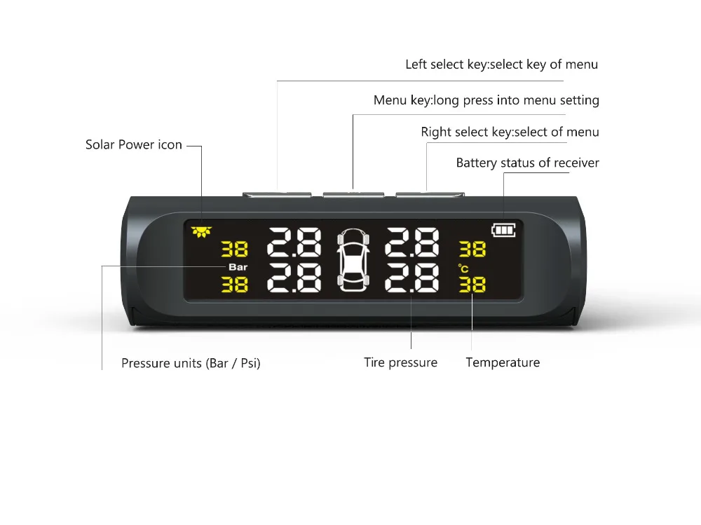 Tymate имеет автоматическую солнечную зарядку панелей солнечных литиевых батарей, что может продлить время использования. Прикуриватель или USB также можно использовать, когда нет солнечного света. Он имеет пять типов сигналов тревоги, включая высокое давление, низкое давление, высокую температуру, быструю утечку воздуха и сигнал о низком заряде батареи, быстро сообщая о ненормальном состоянии шин.