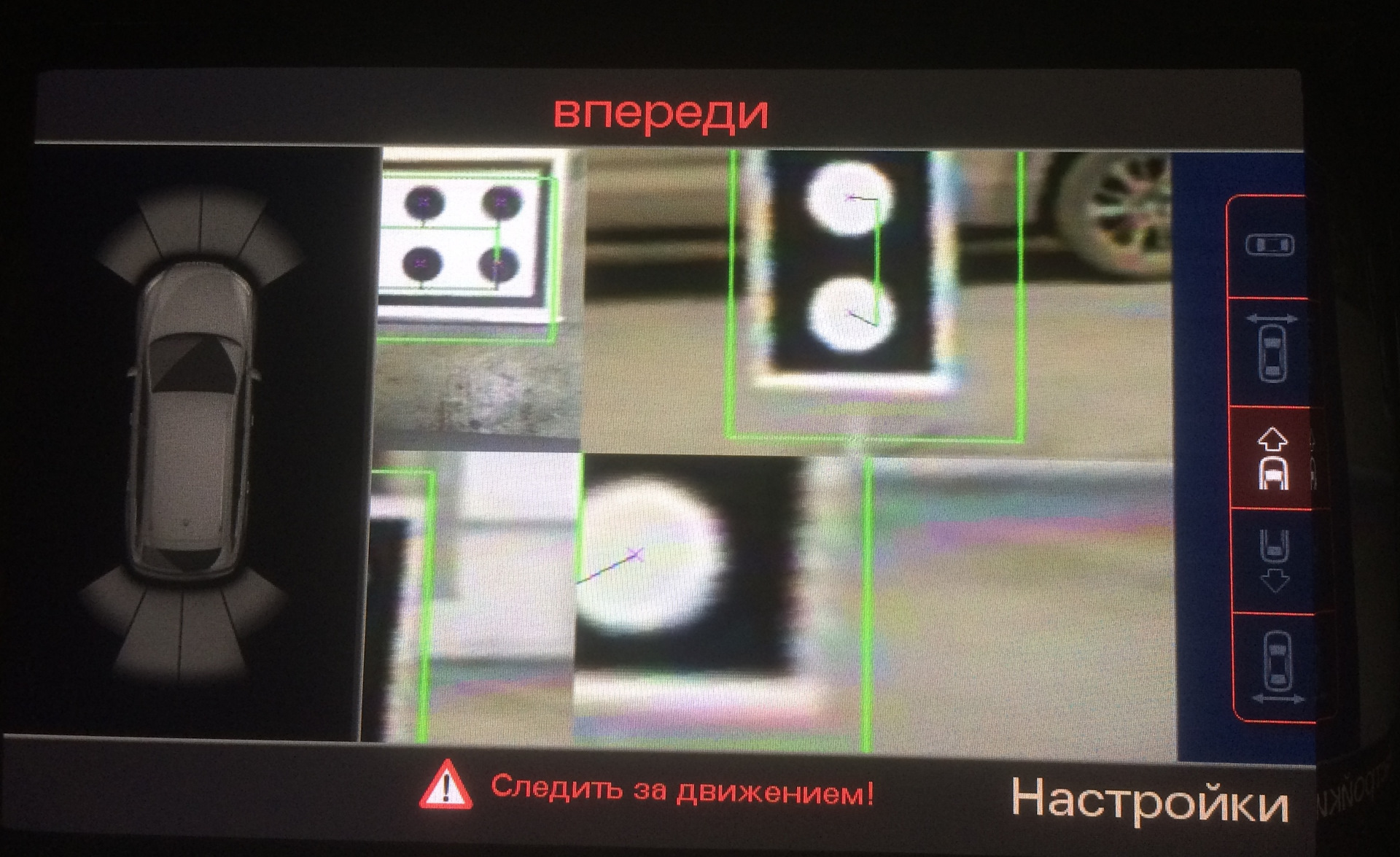 Было установлено четыре камеры: заднего и переднего вида, а также две боковые камеры (в зеркалах). С помощью которых формируется общее изображение ( вид сверху) и полный контроль за ситуацией по всему периметру автомобиля.