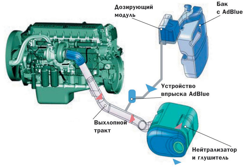 Для хранения DEF добавлен накопительный бак (наподобие топливного бака). Чтобы доставить DEF туда, где он должен быть, был добавлен дозирующий механизм (например, топливный насос), а также сам дозатор (например, топливная форсунка). Была добавлена трубка для разложения. В этой трубке происходит химическая реакция (тепло). Чтобы предотвратить замерзание DEF при более низких температурах, были также добавлены нагреватель и линии нагревателя. ECU содержал стратегию и имел право управлять всей системой.