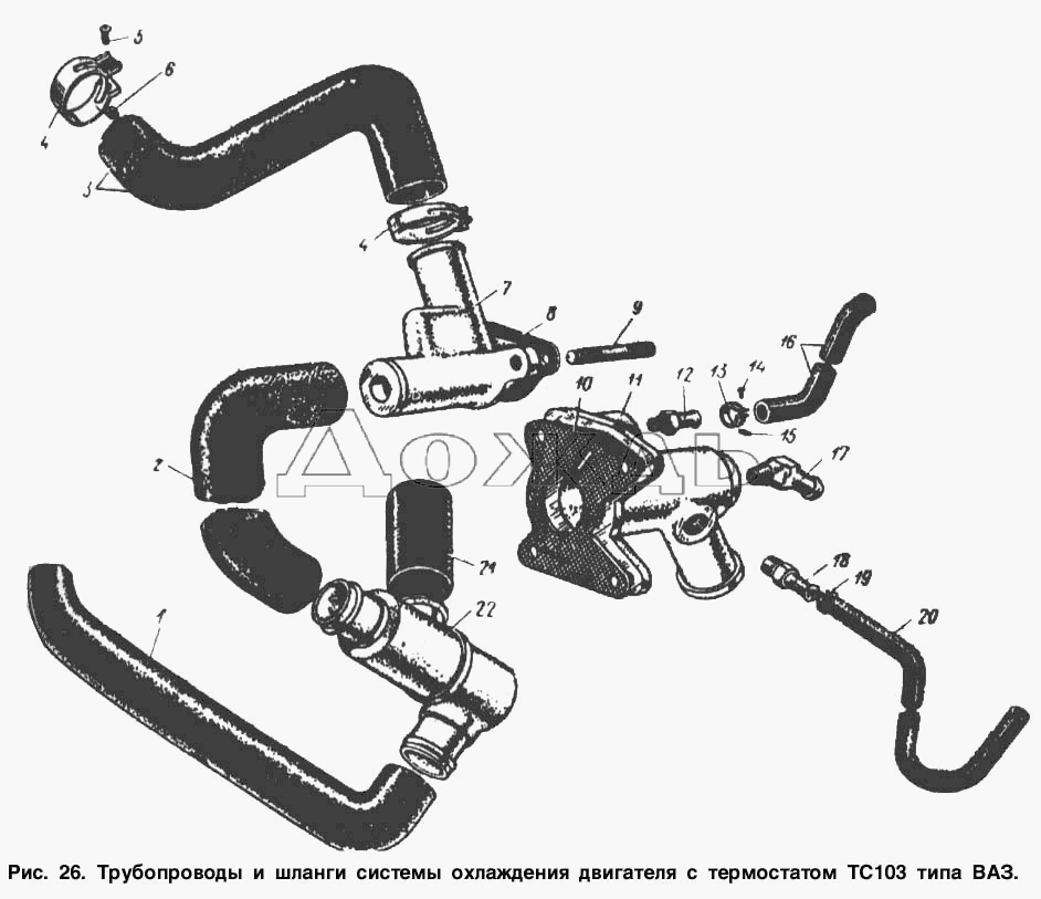 сердцевину или остов радиатора. К остову припаяны резервуары из латуни, составляющие вместе с основаниями верхний и нижний бачки радиатора.В верхнем бачке радиатора находится заливная горловина с патрубком для отвода паров, воздуха и охлаждающей жидкости в расширительный бачок, а также патрубок подводящей трубы, по которой в радиатор на охлаждение поступает жидкость из головки цилиндров. В нижнем бачке установлен патрубок, на который надевается шланг, отводящий от радиатора к термостату охлаждающую жидкость. Пробка радиатораПробка радиатора герметично закрывает горловину радиатора. Герметичность обеспечивается резиновой уплотнительной прокладкой 5 (рис. 35),