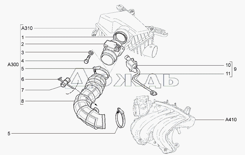 Простейшая система впуска инжекторного двигателя состоит из следующих деталей: