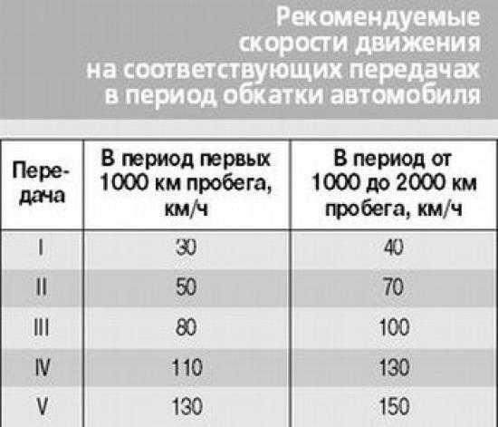 Немного иже указаны предпочтительные режимы езды в период начальной и последующей обкатки двигателя. Незначительные отклонения в скоростном режиме данного графика обкатки вполне допустимы. На каждой передаче величина рекомендуемых скоростей соответствует приемлемым оборотам двигателя, так как тахометром обладают не все автомобили.