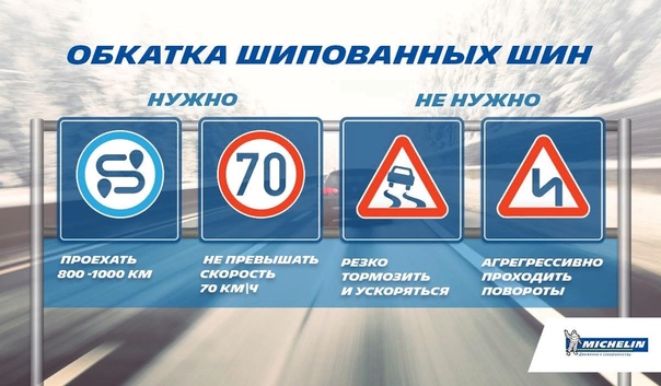 - Обкатывать шипованную резину рекомендуется на скорости не выше 70 километров в час, поэтому лучше избежать дальних поездок по загородному шоссе на новых покрышках;
