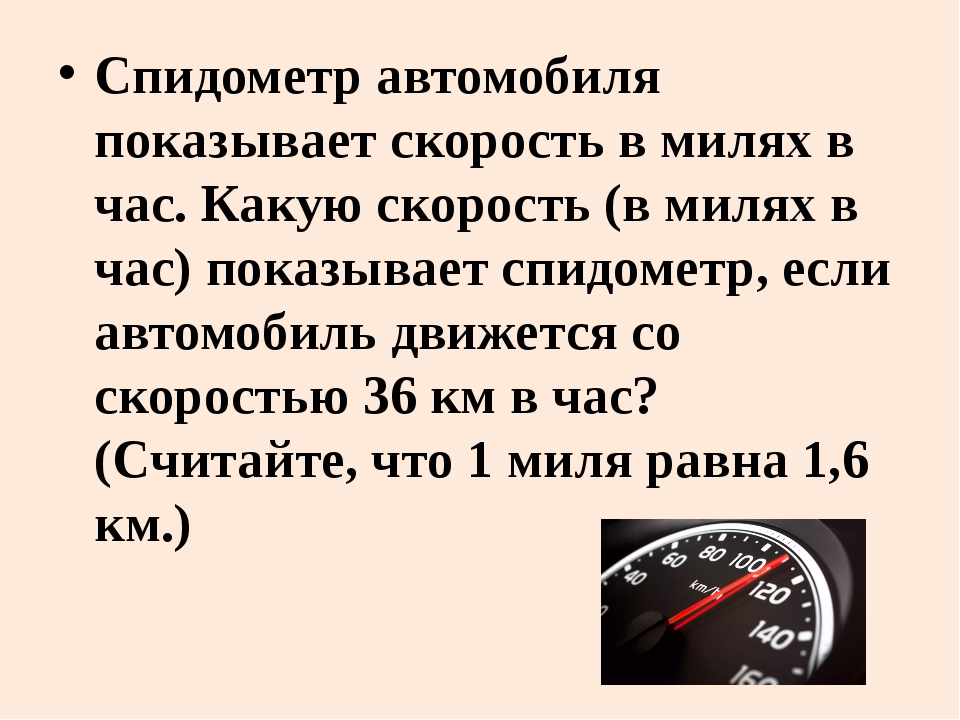 Если спидометр автомобиля показывает скорость в милях в час, то как перевести в километры в час? Это касается машин из Америки, где изначально приборы калибруются в непривычных числах. Считайте, что 1 миля равна 1,6 км. Значит, если спидометр показывает скорость 90 миль/ч, то это 144 км/ч (90 х 1,6 = 144 км/ч). Обратный подсчет из км/ч в миль/ч производиться путем деления на 1,6.