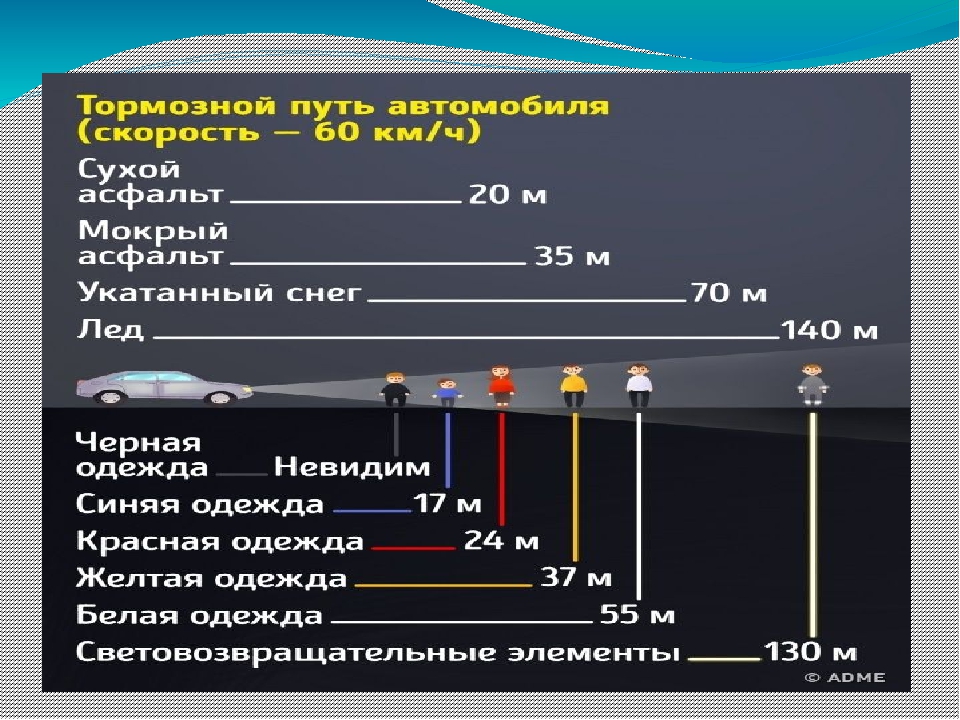 Если машина движется со скоростью 60 км/ч и больше, то она не успевает остановиться перед таким выруливающим автомобилем, так как ее тормозной путь на сухом асфальте составит 23 м, а в гололед превысит 30 м.