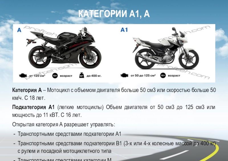 Эта категория дает право управлять мотоциклами. У нее три подкатегории: