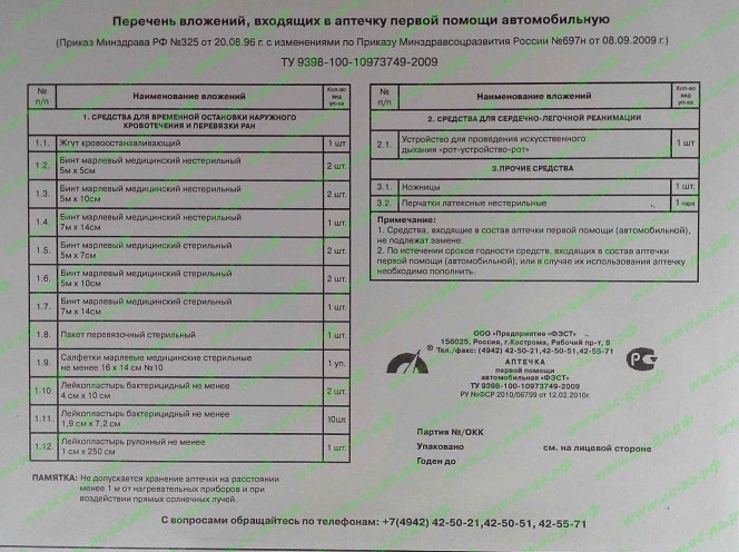 Автомобильная аптечка в Беларуси 2023, список вложений