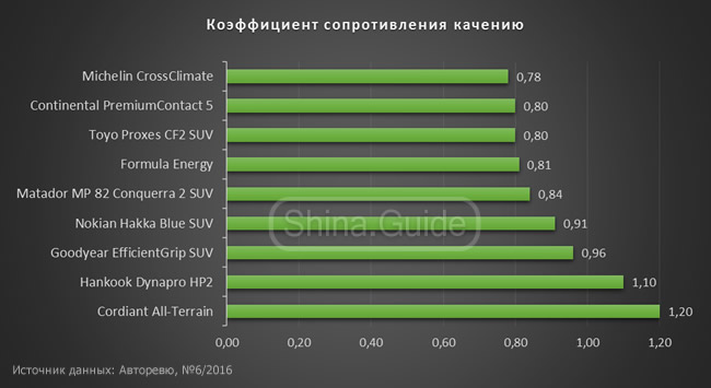 - «Коэффициент сопротивления качению (RRC). Ценность силы сопротивления качению разделилась на груз колеса. Общество Автомобильных Инженеров (SAE) развило испытательные методы, чтобы измерить RRC шин. Эти тесты (SAE J1269 и SAE J2452) обычно выполняются на новых шинах. Когда измерено при помощи этих стандартных испытательных методов, самые новые пассажирские шины сообщили о RRCs в пределах от 0,007 к 0,014». В случае велосипедных шин достигнуты ценности 0,0025 к 0,005. Эти коэффициенты измерены на роликах, с метрами власти на дорожных покрытиях, или с двигаются вперед без усилий тесты. В последних двух случаях должен быть вычтен эффект сопротивления воздуха, или тесты выполнены на очень низких скоростях.