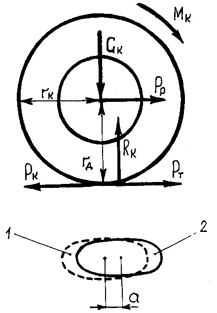 Как видно на этом увеличенном виде, и колеса, и поверхность подвергаются деформации в степени, определяемой упругими свойствами двух поверхностей.