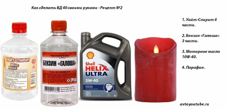 Если сделать ВД 40 самостоятельно по такому рецепту, вы получите смесь не только не уступающую оригинальному изделию, но и по цене изготовления гораздо ниже магазинному аналогу.