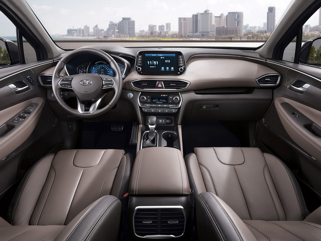 Интерьер Гранд Санта Фе оформлен в популярном нынче стилистическом направлении «hi-tech», согласно которому в салоне основной акцент делается на высокотехнологичность отдельных элементов, и высокий уровень отделки. Отдельно хочется отметить стильную приборную панель, в основе которой лежит большой сенсорный дисплей и два мощных динамика.