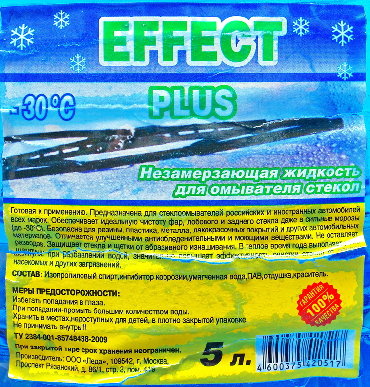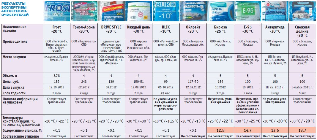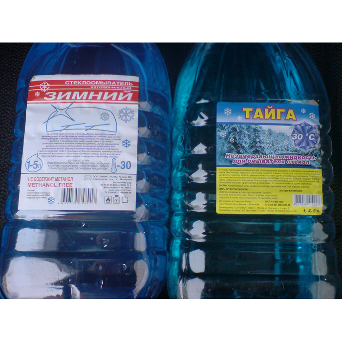 От обычной воды они отличаются отсутствием солевых отложений и разводов после высыхания, а также улучшенными чистящими свойствами. - Незамерзающая жидкость для омывания стекол в отличие от первого вида исключает возможность кристаллизации при определенной минусовой температуре. Около 70% ее состава — спирт, остальная часть приходится на различные модификаторы, красители и т. п.