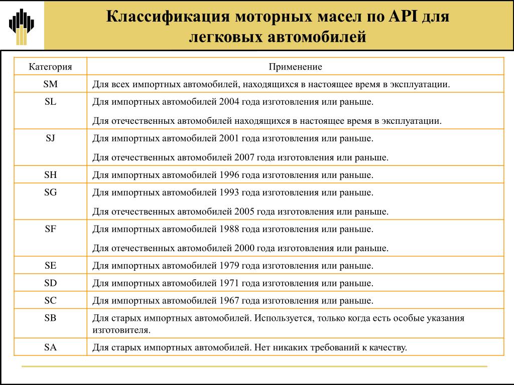 | SL | Для двигателей до 2004 года. Новые тесты на степень износа (Seq IVA), моющие свойства (TEOST MHT4), окисление (Seq IIIF) и низкотемпературные отложения (Seq VG) для лучшей защиты двигателя и продления интервала замены масла. Стандарт SL заменил API SJ в середине 2001г. |