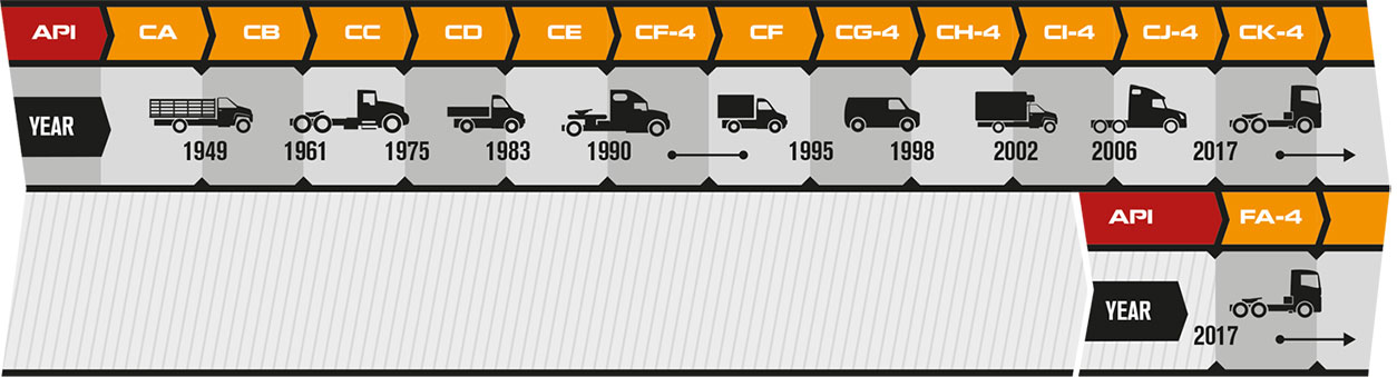 Эти масла разработаны для использования на магистральном большегрузном транспорте при использовании дизельного топлива с содержанием серы до 15 ppm (0,0015% по массе). API FA-4 масел, не являются взаимозаменяемыми или не имеют обратной совместимости с маслами категорий API CK-4, CJ-4, CI-4 Plus, CI-4, и CH-4. Смотрите рекомендациями производителя двигателя, чтобы определить, являются ли масла API FA-4 пригодными для использования. API FA-4 масла не рекомендуется для использования с топливом, содержащем более 15 ppm серы