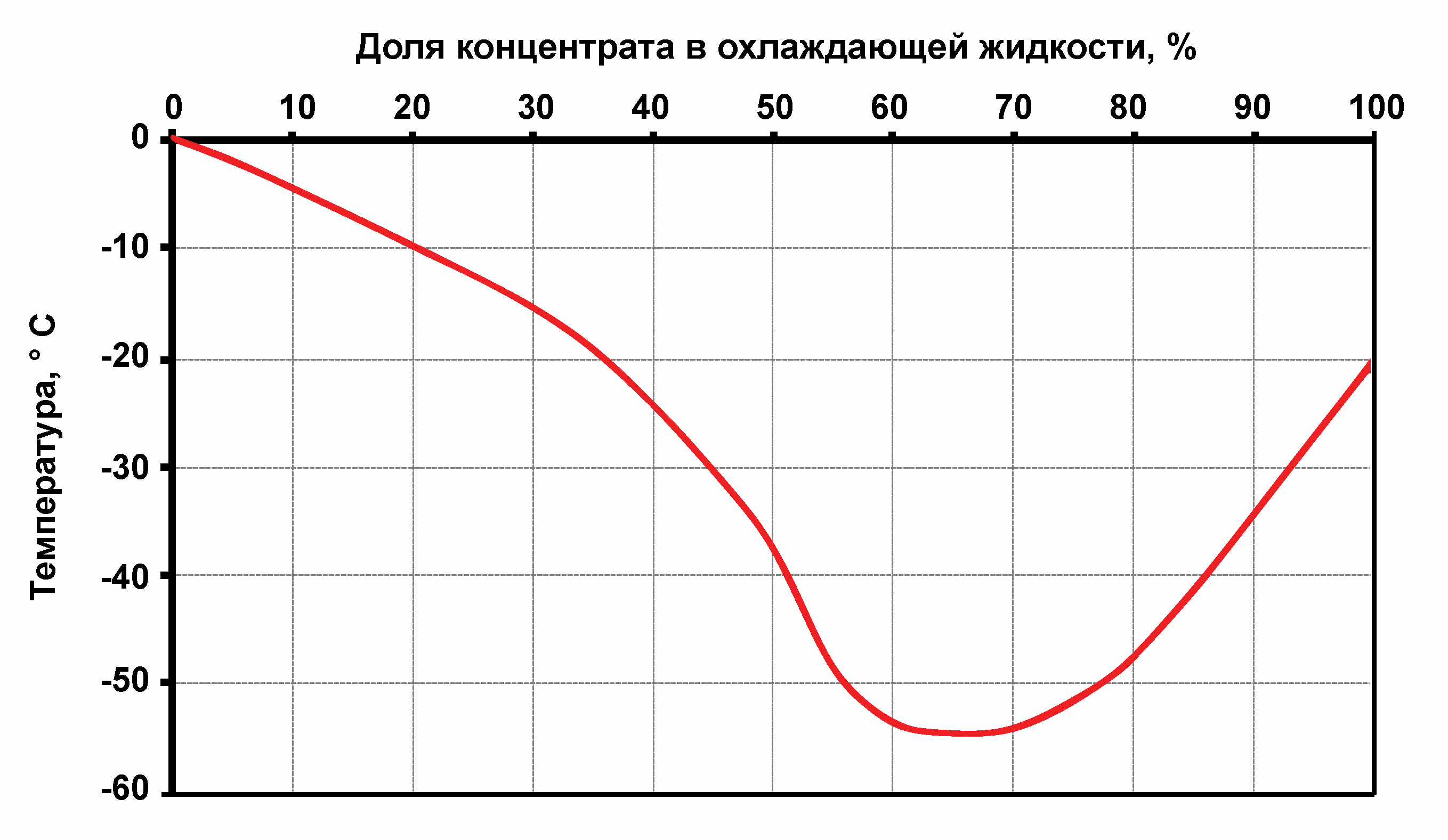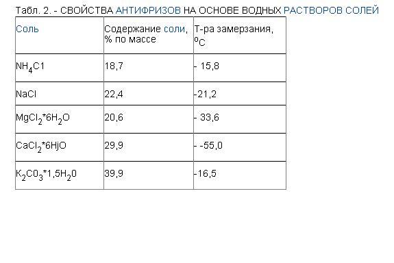 Растворы солей натрия, кальция и магния имеют значительно меньшую точки замерзания, чем у растворов сахара, и при гораздо более низких концентрациях и обеспечивают защиту при значительно более низких минимальных температурах. Глицерин и этиленгликоль обеспечивает защиту при почти такой же низкой минимальной температуре, как кальций хлорид, который является наиболее эффективным из солей, но только примерно в два раза больше концентрация.Следующими по эффективности являются древесный спирт и денатурированный спирт. концентрации 50 и 70 процентов по объему и устойчивы к замерзанию при температура -40 град. fahr.