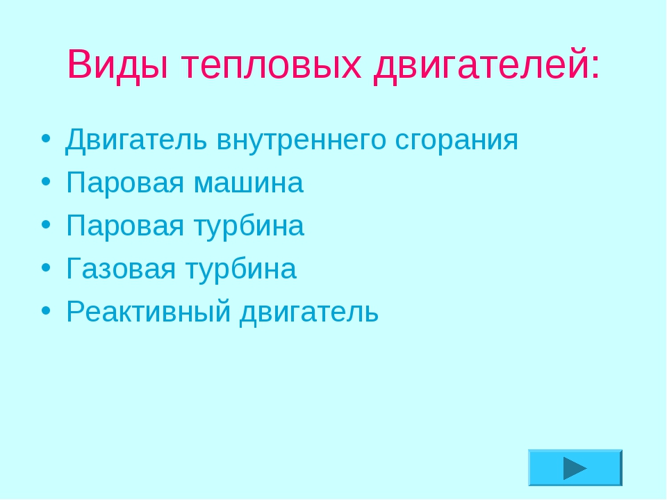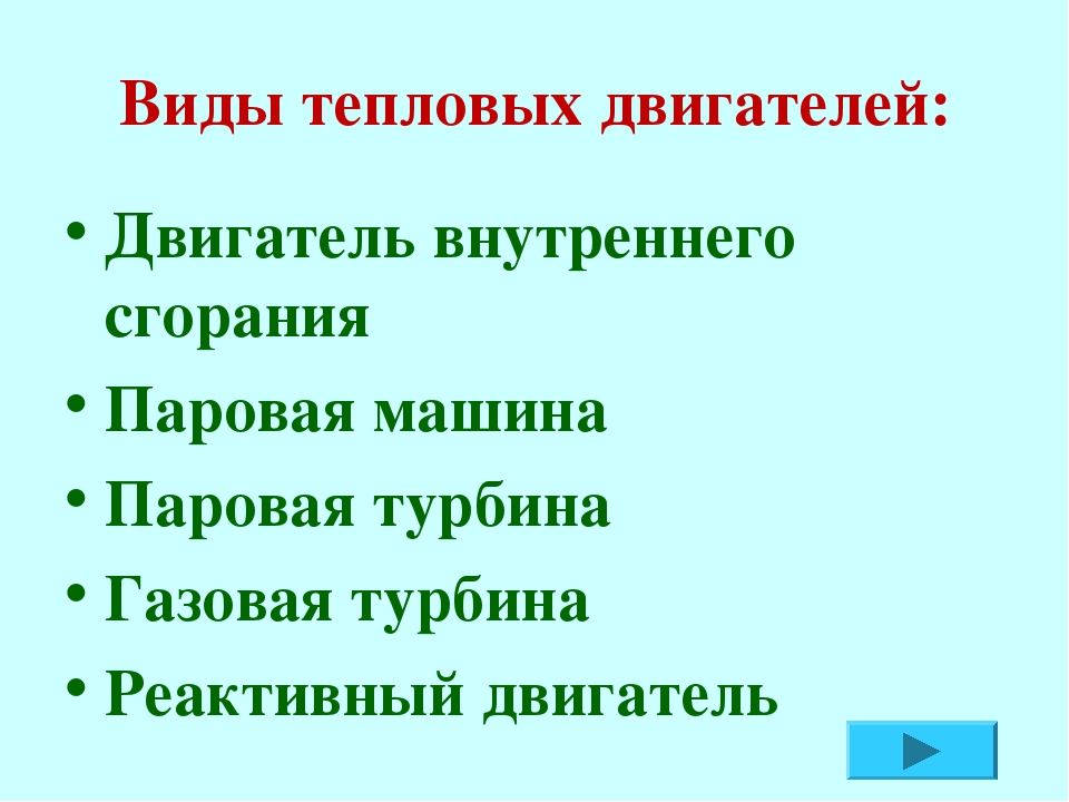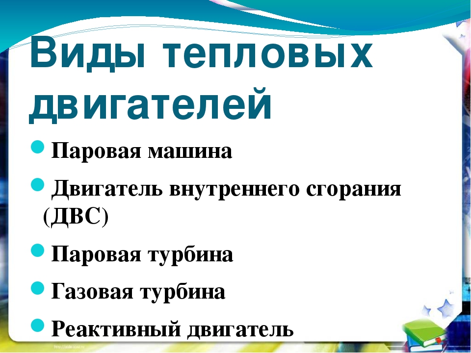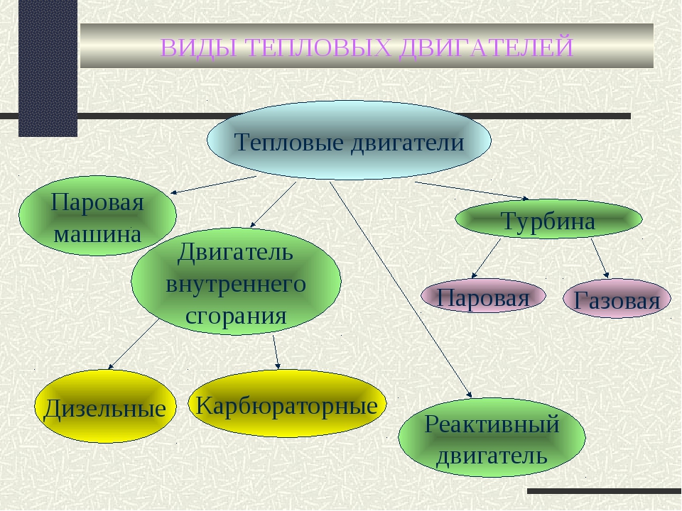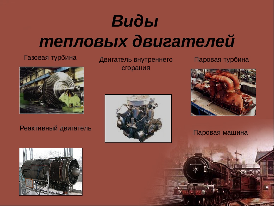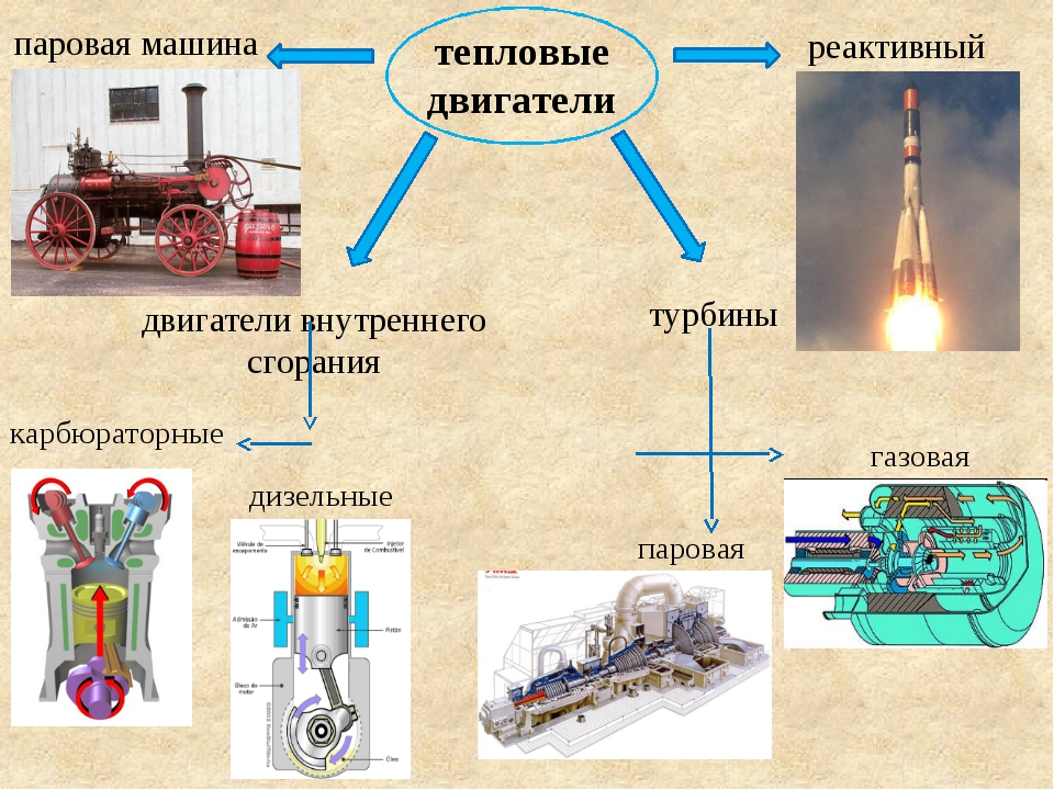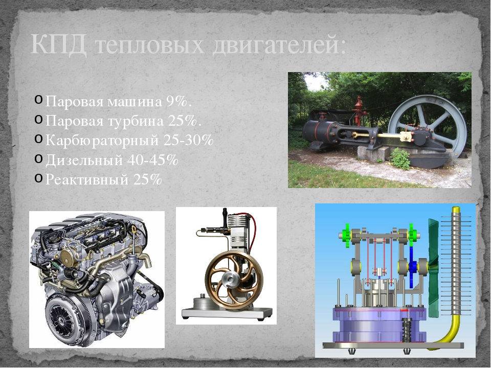 Используя слайды, презентации, вводится понятие тепловых двигателей