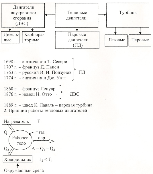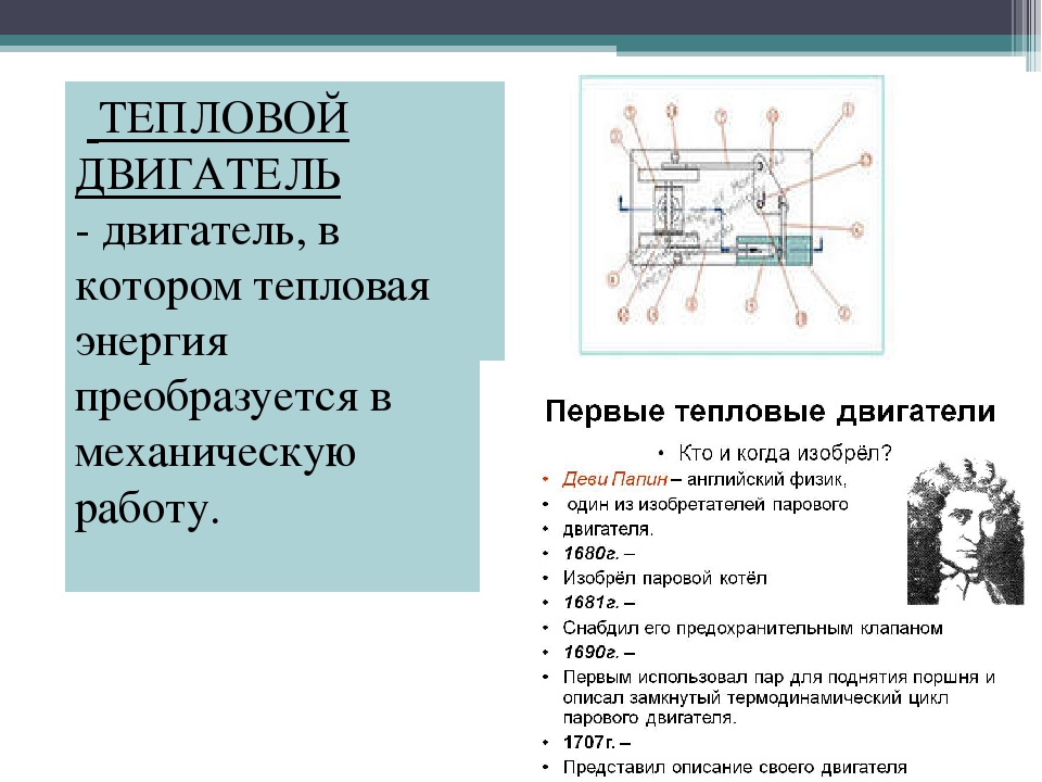 Знакомит обучающихся с историей создания тепловых двигателей. Кратко рассказывает о принципе действия теплового двигателя