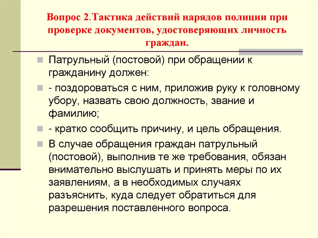 При проверке документов или установления анкетных данных необходимо выполнять определенные действия. При обращении к гражданину (даже злостному нарушителю) следует поздороваться с ним, приложив руку к головному убору, назвать свою должность, звание и фамилию, кратко изложить причину и цель проверки документов, затем в вежливой форме потребовать предъявления нужного документа. В этот момент нужно быть особенно внимательным, так как бдительность в некоторых случаях помогает сразу же распознать правонарушителя. Например, при поисках требуемого документа гражданин может случайно вытащить сразу два паспорта или другие предметы, свидетельствующие о его причастности к преступлению. Внешний вид проверяемого может указать на признаки борьбы (царапины, укусы, порванная, грязная или помятая одежда, следы крови и т.
