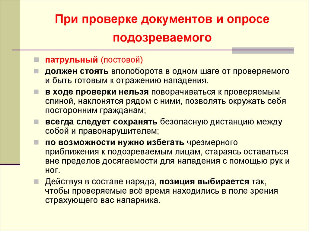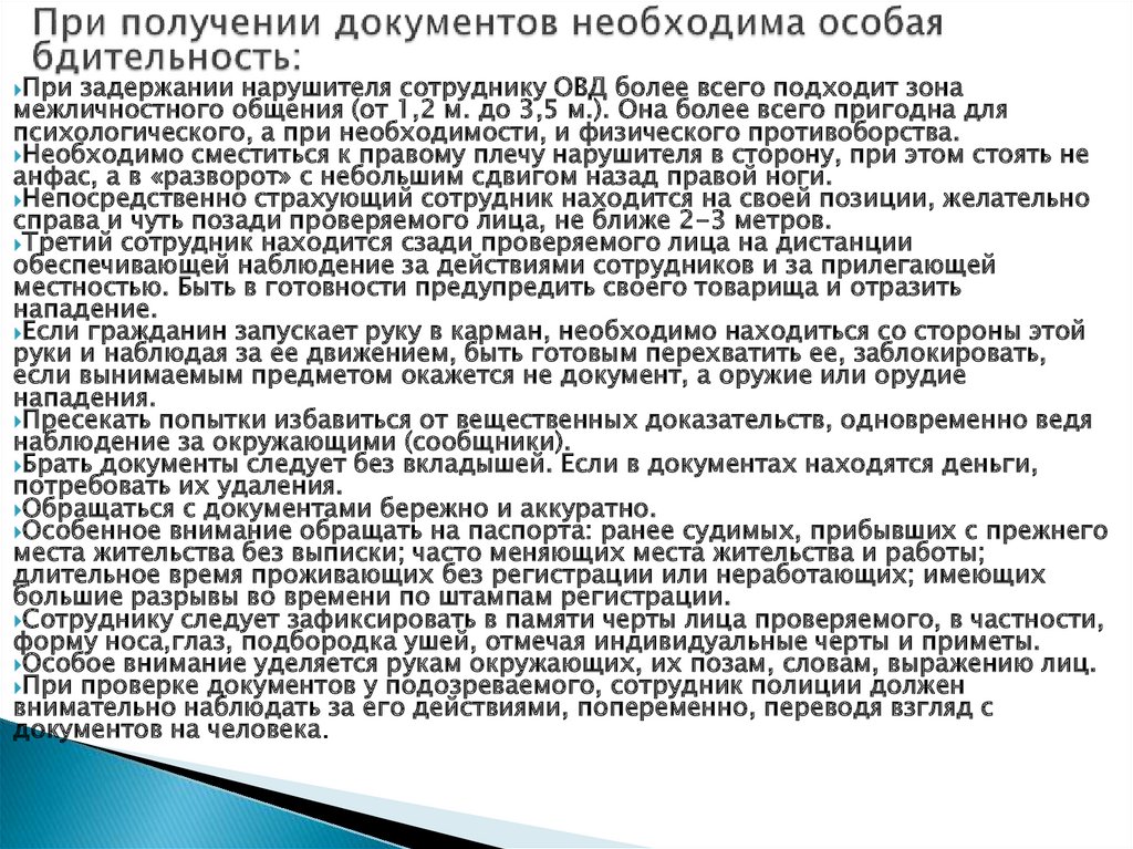 Следует всегда помнить, что перед вами может стоять преступник, готовый к нападению, поэтому желательно при просмотре документа отойти от проверяемого на несколько шагов в сторону под каким-либо благовидным предлогом, но одновременно быть готовым предотвратить возможный побег.