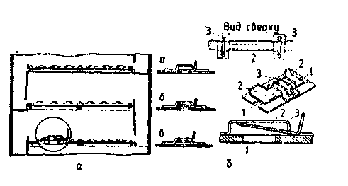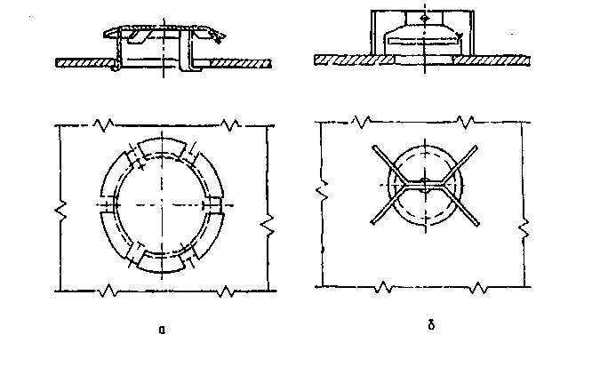 Принцип работы круглого клапана состоит в том, что диск клапана, свободно лежащий над отверстием, поднимается и опускается в зависимости от скорости газа, и, таким образом, за счёт собственной силы тяжести автоматически регулирует величину зазора между тарелкой и клапаном. Максимальная высота подъёма диска определяется ограничителями. Обычно эта высота не превышает 8 мм. Клапаны имеют диаметр 45-50 мм. Ограничители круглых клапанов выполняются обычно в виде 3-4 направляющих «ножек» и крепятся либо к самому диску клапана (рис. 25 а), либо к тарелке вокруг диска (рис. 25 б).