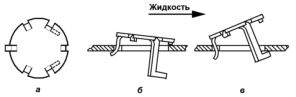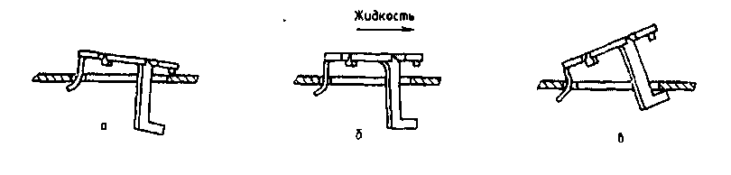 Тарелка имеет прорези прямоугольной формы, которые перекрываются L -образными пластинчатыми клапанами, удерживаемыми скобами. В нерабочих условиях клапан под действием собственного веса закрывает прорезь (рисунок 3.26, а), в рабочих условиях поток пара заставляет приподняться более легкую часть клапана (рисунок 3.26, б), пар проходит в образовавшуюся щель и контактирует с жидкостью на тарелке, инжектируя ее в направлении движения к сливному стакану или сегменту. При дальнейшем возрастании нагрузки по газу клапан полностью поднимается.
