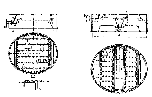 Стандартом предусмотрены тарелки однопоточные (рисунок 3.28) диаметром 1000…4000 мм, двухпоточные (рисунок 3.29) диаметром 1400…9000 мм и четырехпоточные – 3200…5500 мм. Тарелки выполняют разборными. Тарелку любого из этих диаметров можно изготовить в трех вариантах с шагом между рядами клапанов 50, 75 и 100 мм, что предопределяет различное число клапанов и соответственно разную площадь свободного сечения тарелки. Кроме того, для каждого из этих вариантов предусмотрены две модификации тарелок, отличающиеся площадями слива. При больших диаметрах (7000….9000 мм) две смежные по высоте тарелки опираются на общую центральную балку и каждая тарелка имеет боковые балки.
