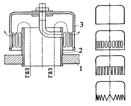 1 – тарелка, 2 – газовые патрубки, 3 – круглые колпачки