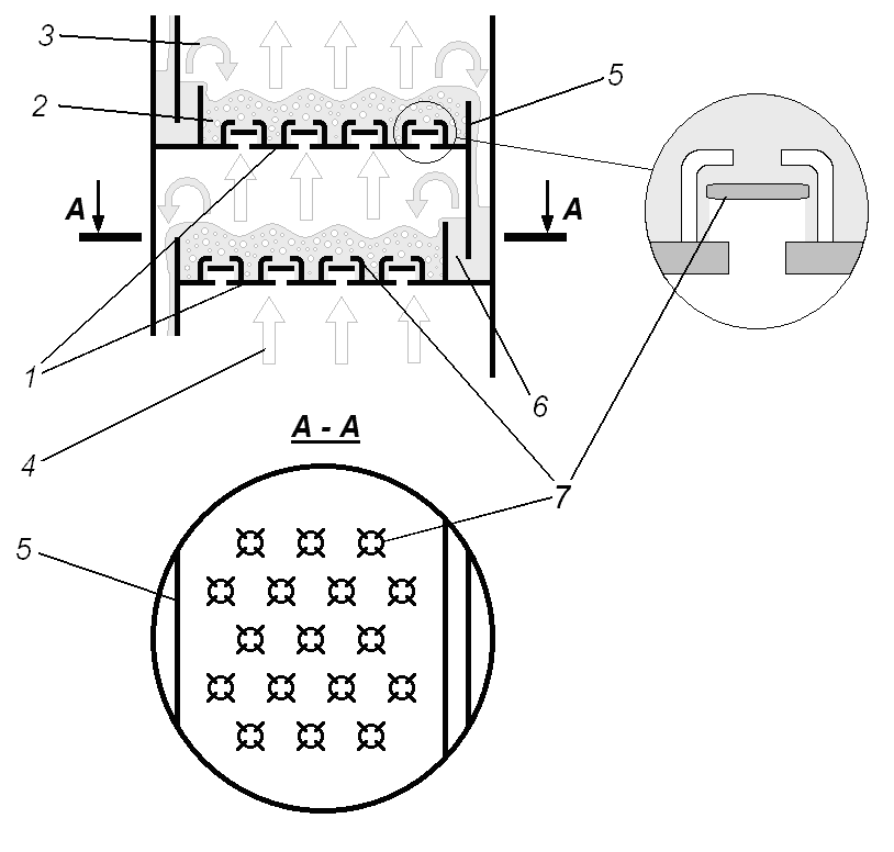 1 – тарелки, 2 – барботажный слой (пена), 3 – поток жидкости, 4 – поток газа, 5 – переливной порог, 6 – гидрозатвор, 7 – клапаны