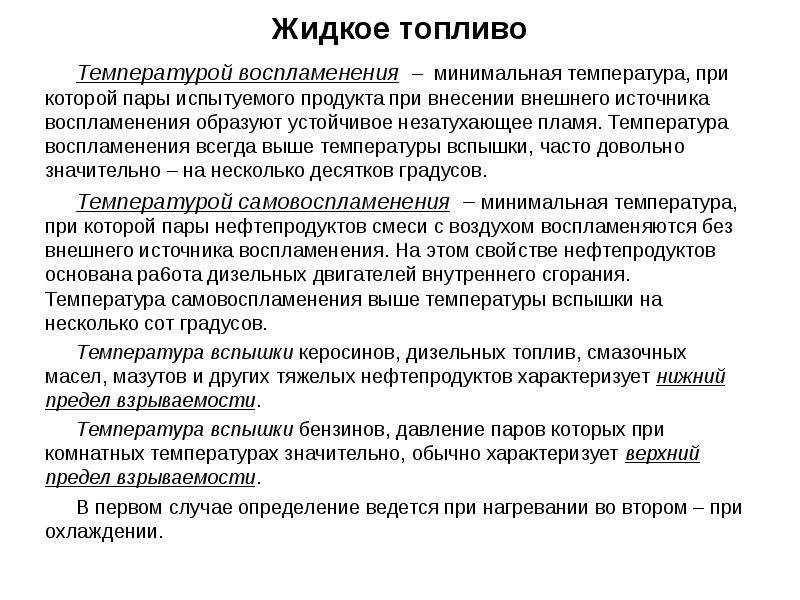 При температуре воспламенения топливо загорается после вспышки и горит с поверхности длительное время. Температуры вспышки и воспламенения топлива не являются показателями, характеризующими пригодность его для использования в двигателе.
