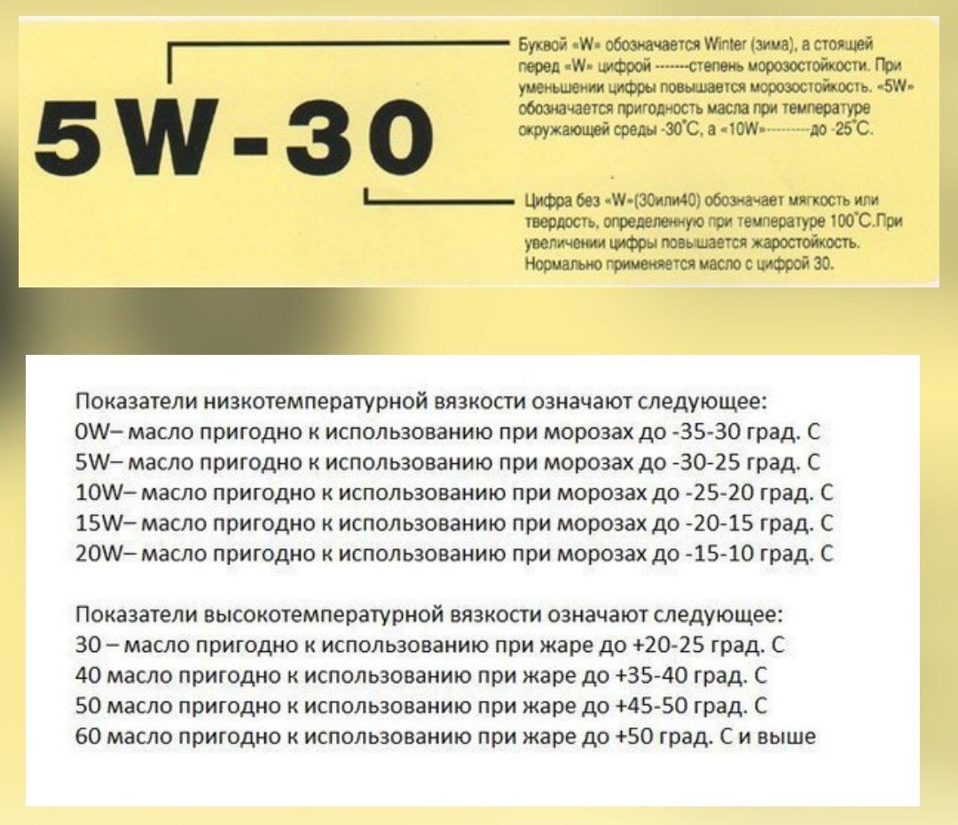 В данном примере, 5W означает низкую тягучесть. Жидкость рекомендовано использовать при температуре не ниже -35°С. Алгоритм такой, от стандартного числа «40» отнимаем то, что написано, получаем исходный градус. Вуаля. Если показатель градуса будет ниже, значит двигателю, стартеру будет сложнее проворачивать коленчатый вал со всеми механизмами.