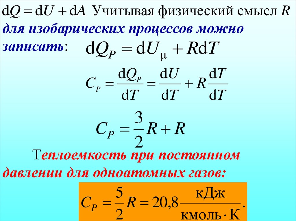 Молярная теплоемкость идеального газа при постоянном давлении больше теплоемкости при постоянном объеме на величину универсальной газовой постоянной R.