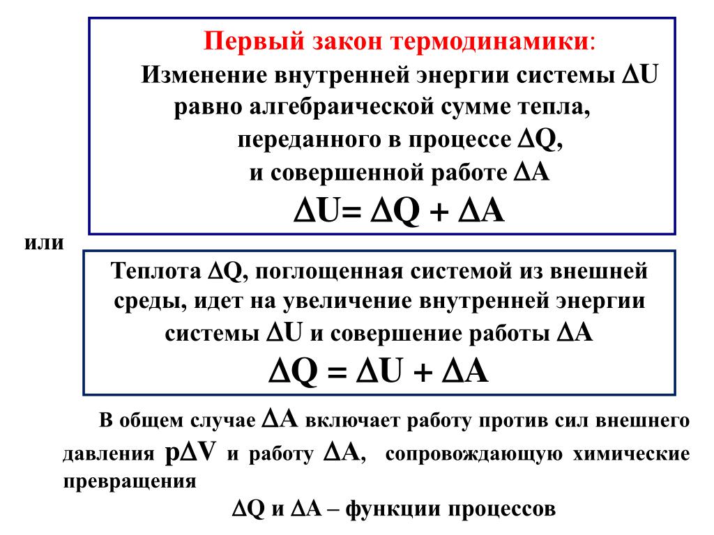 в уравнении ставится отрицательный знак. Внутренняя энергия — это такая же форма энергии, как и потенциальная. энергия объекта на некоторой высоте над землей, или кинетическая энергия движущегося объекта. Точно так же потенциальная энергия может быть преобразована в кинетическую энергию с сохранением полной энергии системы, внутренняя энергия термодинамической системы может быть преобразуется либо в кинетическую, либо в потенциальную энергию. Нравится потенциал энергия, внутренняя энергия может запасаться в системе. Заметьте, однако, что тепло и работа не может быть сохранена или сохранена независимо, поскольку они зависят на процессе. Первый закон термодинамики допускает многие Возможные состояния системы существуют, но только определенные состояния обнаружено существование в природе. второй закон термодинамики помогает объяснить это наблюдение. Если система полностью изолирована от внешней среды,