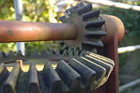 Реечный механизм. Зубчатые и ведущие шестерни по существу представляют собой линейную вариацию цилиндрических зубчатых колес. Стойка шпоры является частью цилиндрическое зубчатое колесо с бесконечным радиус. | |
